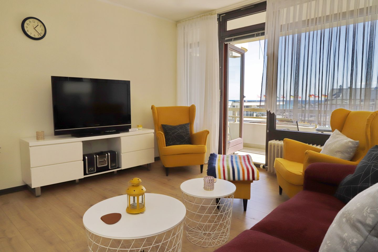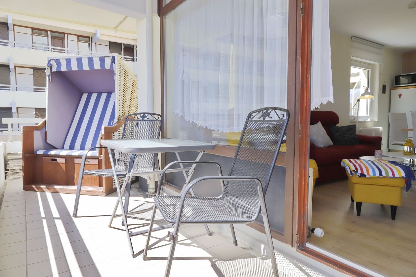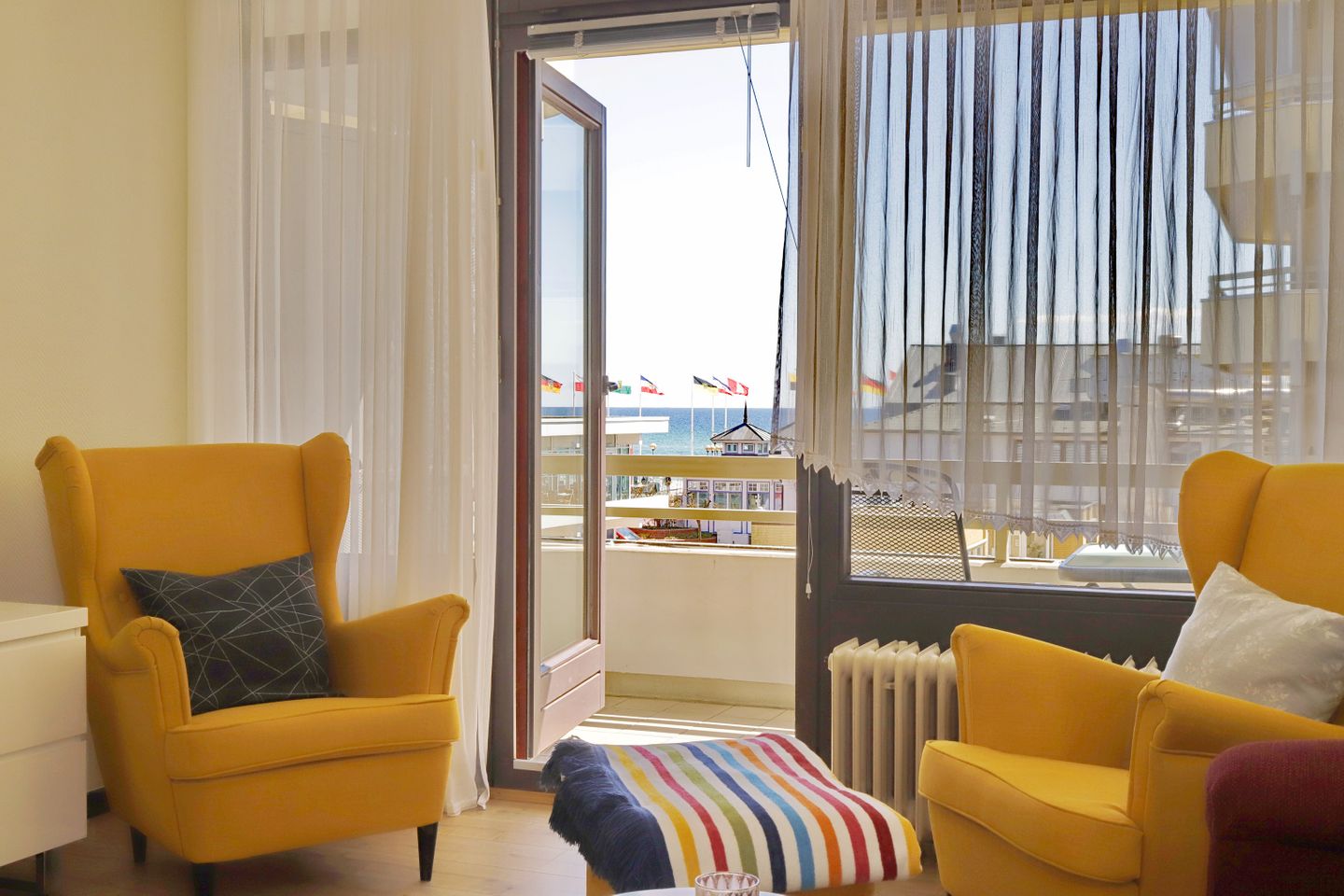 Grandiose Lage mit kleinem Meerblick. Charmant gepflegte Ferienwohnung mit möblierten Süd-/ Westbalkon und Strandkorb am Seebrückenvorplatz.