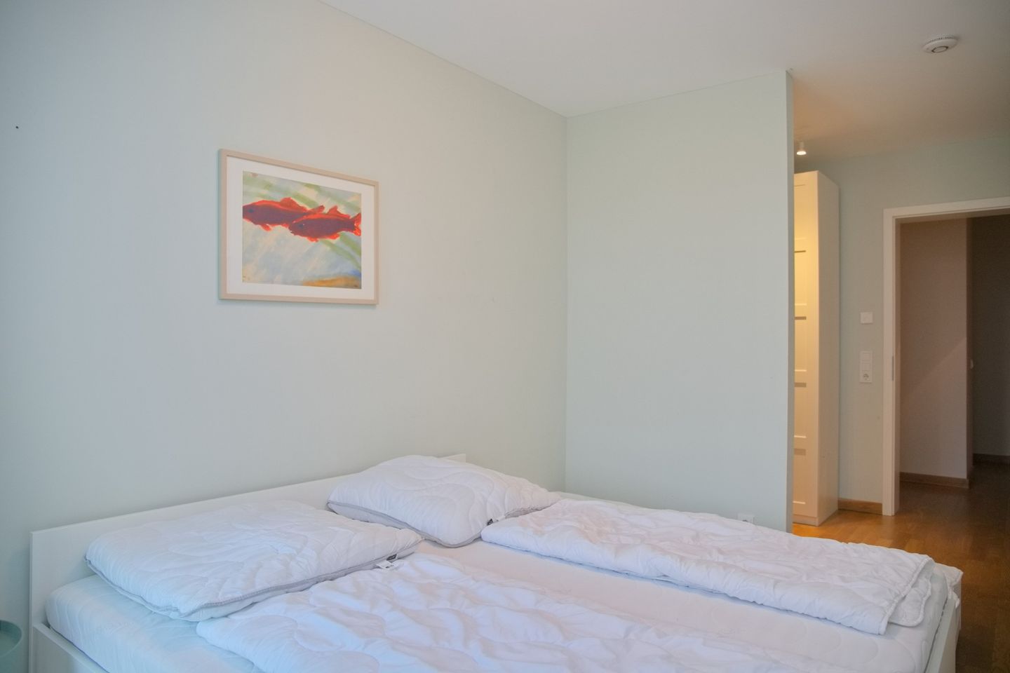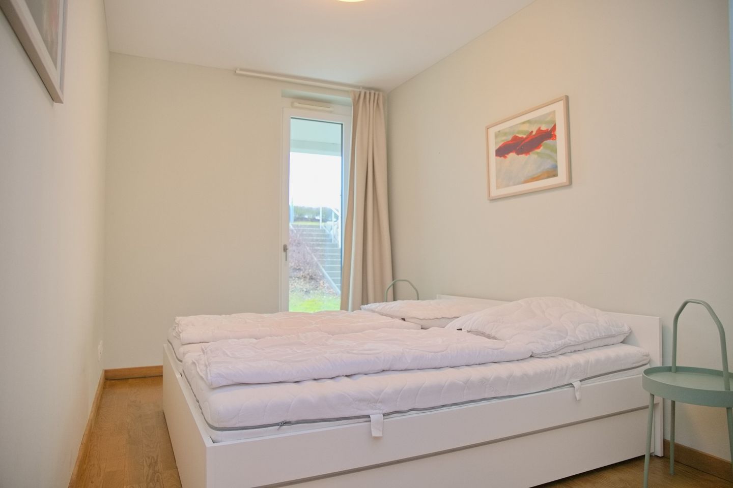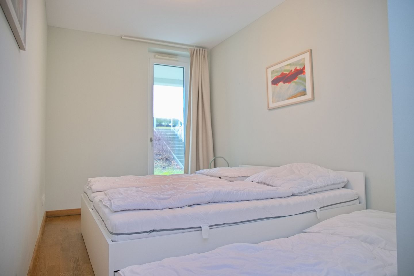 Im Untergeschoss befinden sich die Schlafzimmer und das moderne Duschbad mit bodengleicher Dusche sowie ein praktischer Waschtrocker — perfekt für längere Aufenthalte mit Familie oder Freunden. Ein Schlafzimmer bietet ein Doppelbett mit durchgehender Matratze, das zweite Schlafzimmer ist ebenfalls mit einem Doppelbett ausgestattet und bietet durch die beiden Unterbettschubladen weitere Schlafmöglichkeiten für die 5. und 6. Person, ideal für Kinder oder zusätzliche Gäste. Alle Schlafräume sind ruhig gelegen und garantieren erholsamen Schlaf nach Tagen voller Strand, Promenade und Meer.
