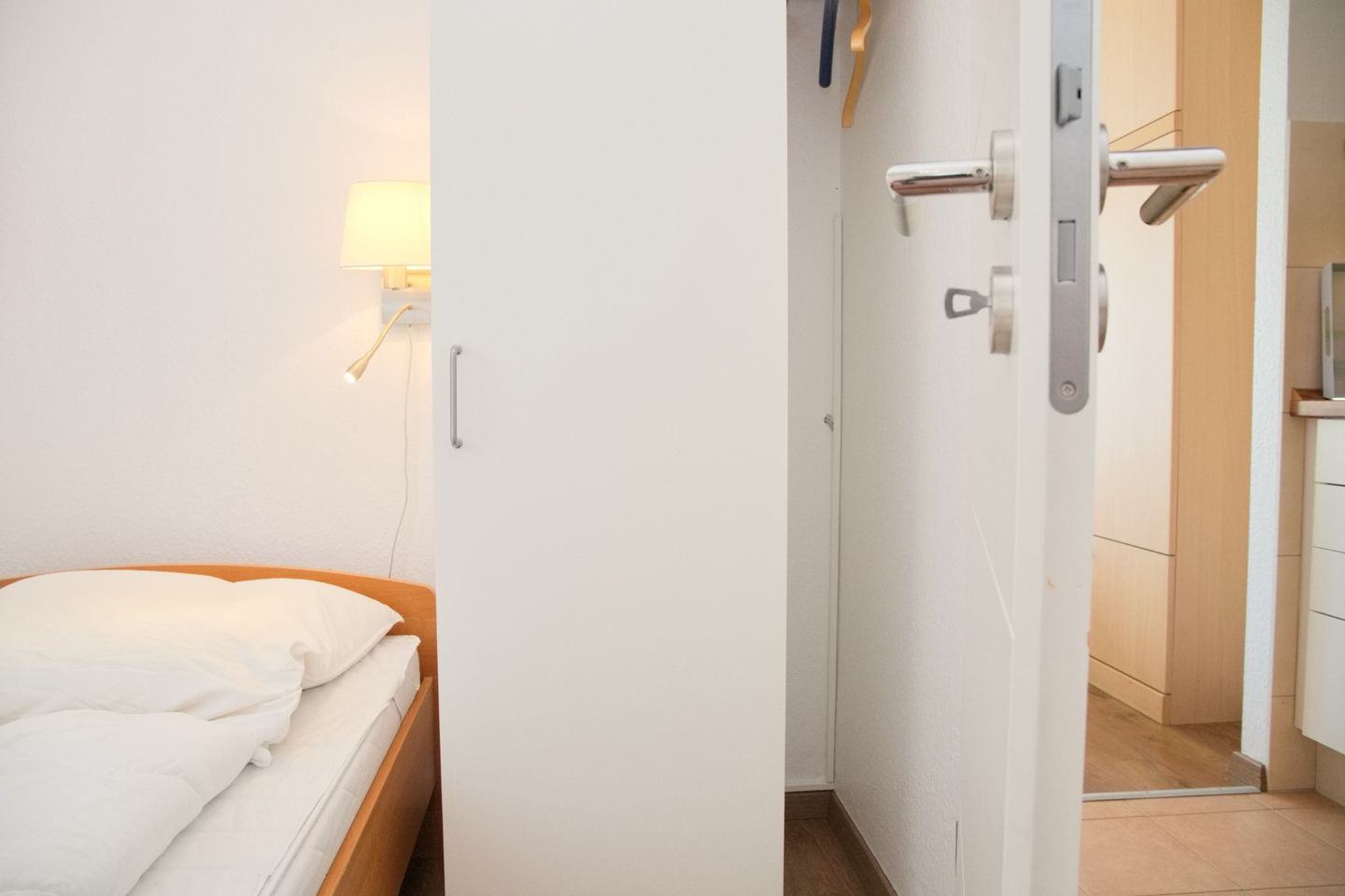 Einbauschrank, Esstisch, Flat-TV, Radio, Verdunkelungsvorhänge und Sichtschutzplissees runden die liebevolle Einrichtung des Appartements ab.