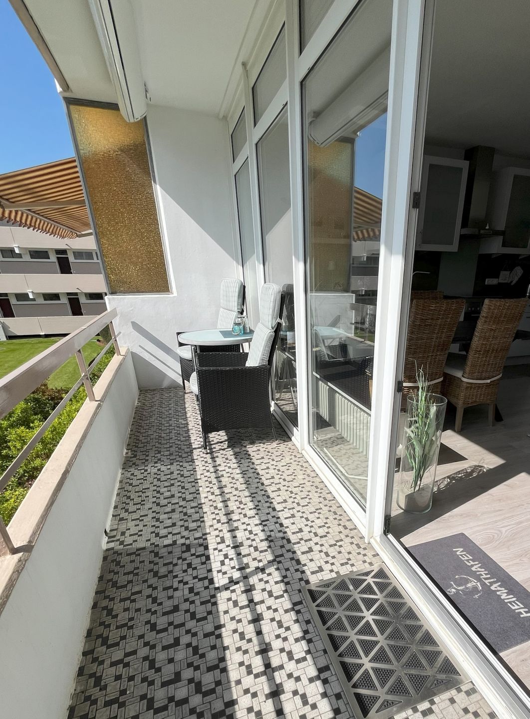 Gemütlicher Balkon mit Markise: Der Balkon lädt zu entspannten Stunden im Freien ein. Die Markise bietet Schutz vor der Sonne und ermöglicht Ihnen, auch an heißen Tagen angenehme Momente im Freien zu verbringen.
