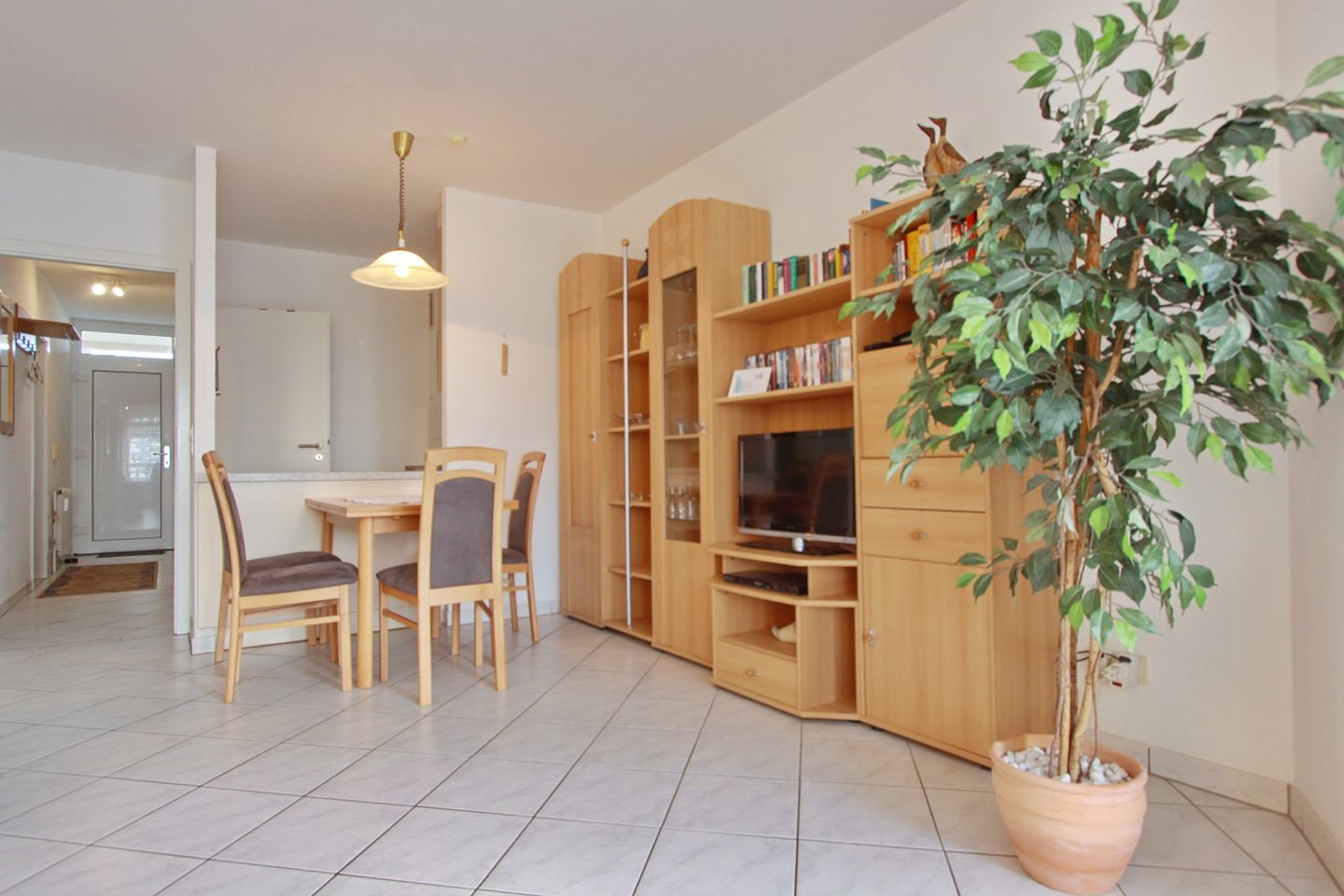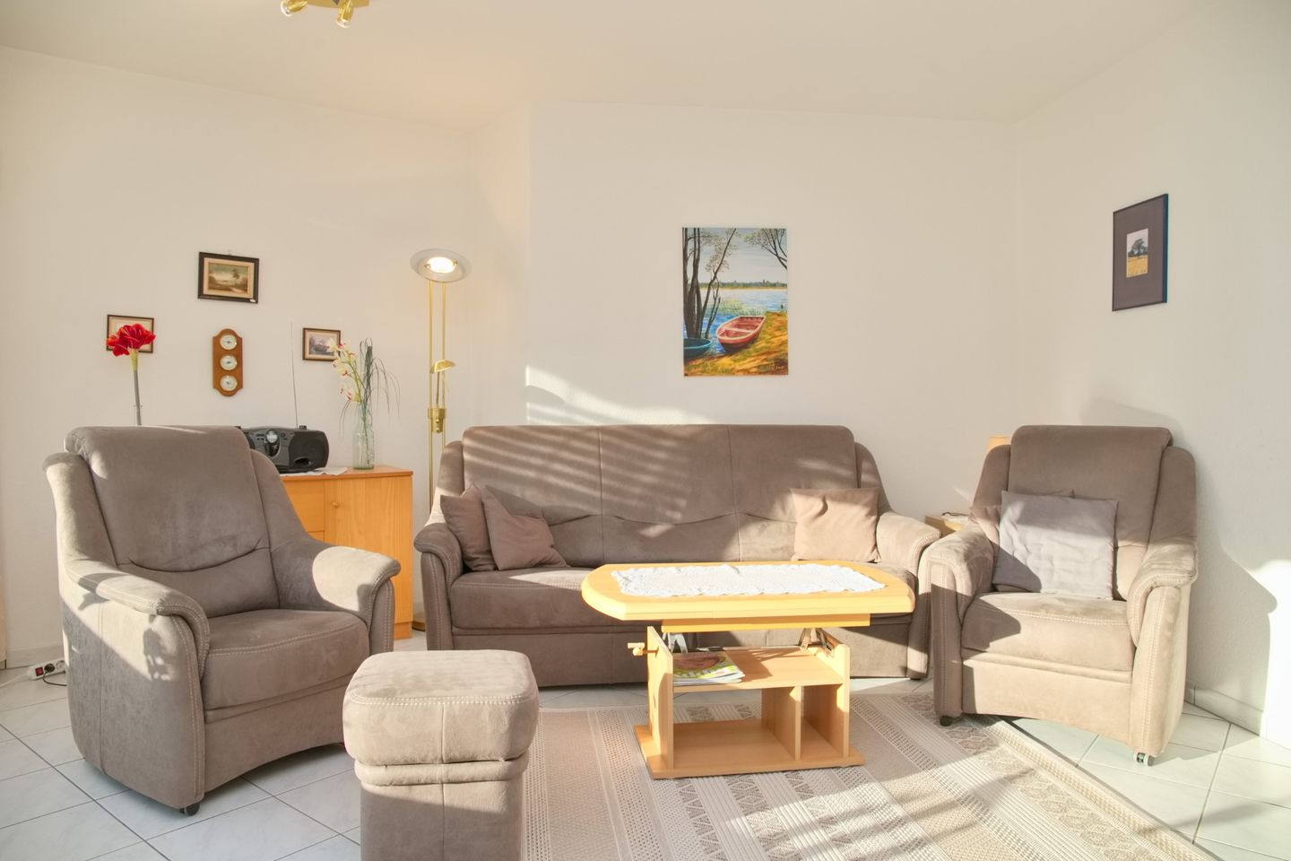 Über den Flur der Wohnung gelangen Sie gerade aus in den kombinierten Wohn- und Essbereich. Hier steht Ihnen neben einer Couchgarnitur mit zwei Sesseln, der Essbereich, ein Flach TV, DVD- Player und ein Radio/ CD zur Verfügung.
