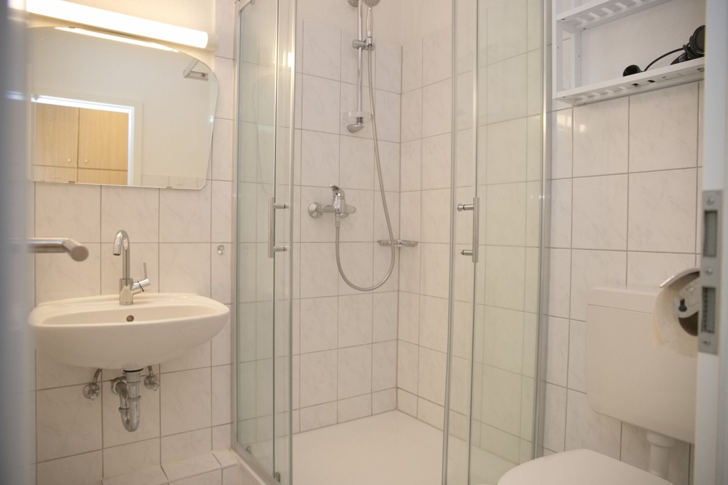Das weiße Duschbad mit WC und Waschbecken komplettiert die Wohnung.