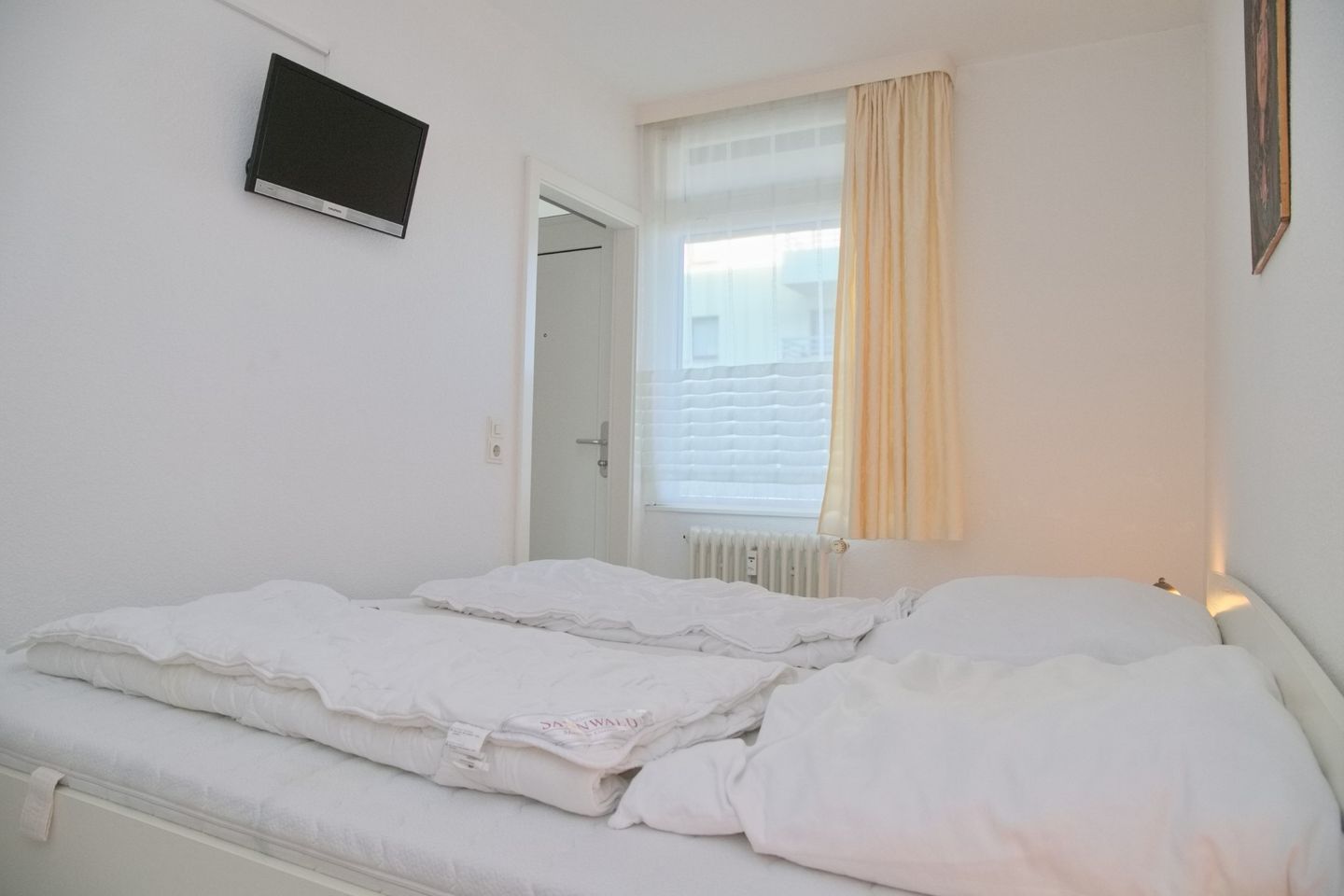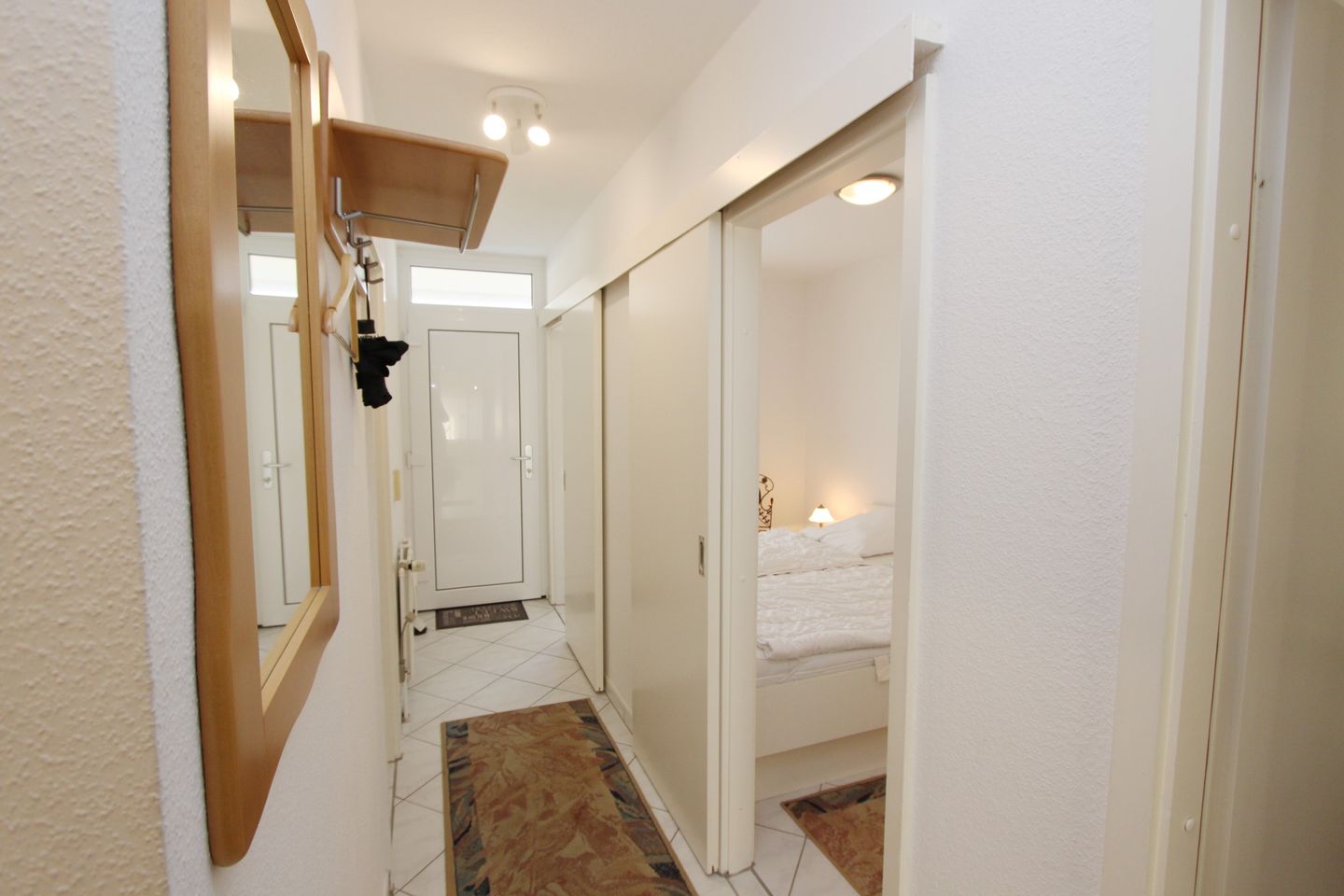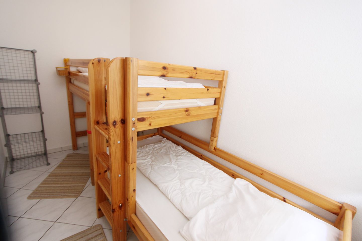 Die separate Einbauküche, mit durchreiche zum Essplatz, ist mit einem Geschirrspüler, einem Cerankochfeld, einer Mikrowelle Plus, einem Kühlschrank mit Gefrierfach, Toaster, Kaffeemaschine und einem Wasserkocher ausgestattet. Zurück auf den Flur gelangen Sie in die zwei separaten Schlafzimmer. Eines der Schlafzimmer verfügt über ein Etagenbett (90x200 cm), das zweite über ein Doppelbett (2x90x200 cm) mit Kommode und Flach TV. Auf dem kleinen Vorflur zum Duschbad bietet der Einbauschrank genügend Stauraum.