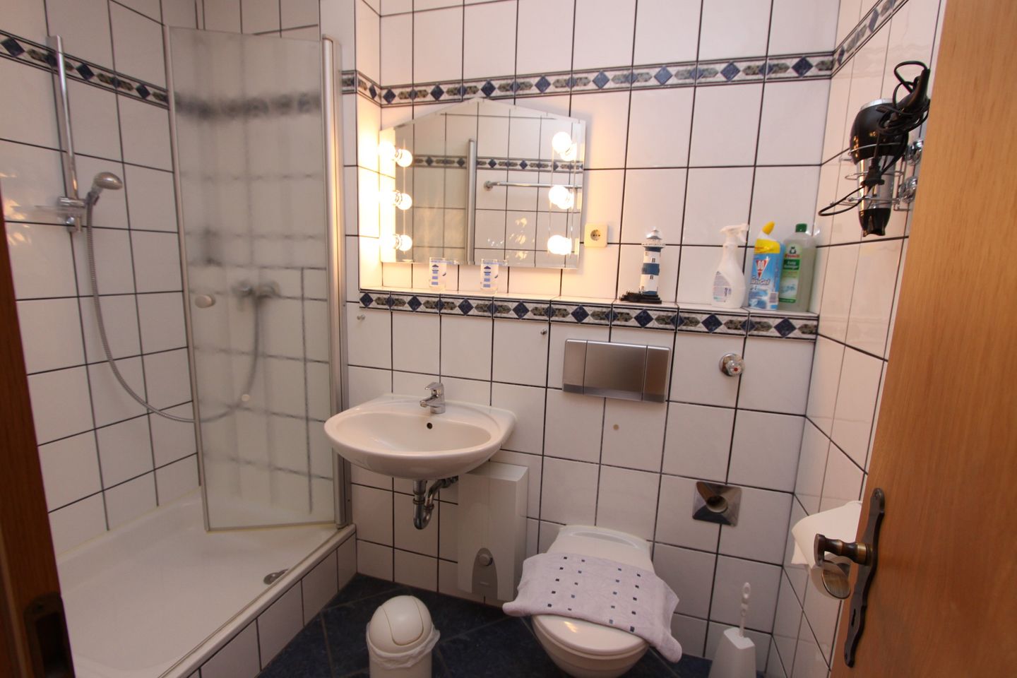 Im Badezimmer befindet sich eine Dusche, ein WC, ein Fön und ein beleuchteter Spiegel.