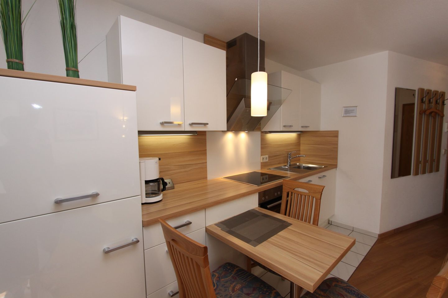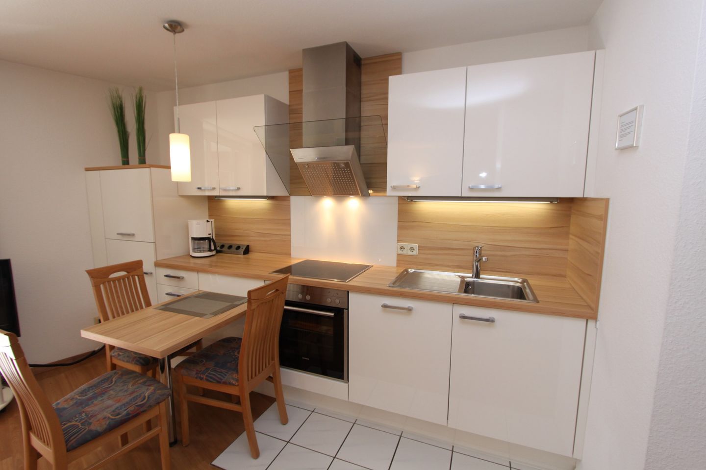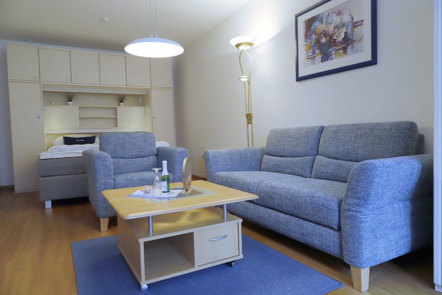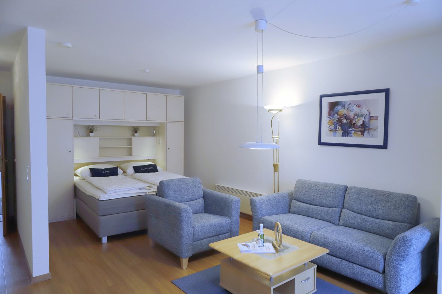 Das gemütliche Wohnzimmer in dieser 1-Zimmer-Ferienwohnung im Erdgeschoss hat eine Zweier Couch mit Schlaffunktion und ein Sessel, einen Flach-TV, ein Doppelboxspringbett und einen Essbereich für 3 Personen und den Zugang zur Terrasse. Die zum Wohnzimmer offene und moderne Einbauküche ist mit einem Ceranfeld, einem Backofen, einem Geschirrspüler, einem Kühlschrank mit Gefrierfach, einer Mikrowelle, einem Wasserkocher, einem Toaster und einer Kaffeemaschine ausgestattet.