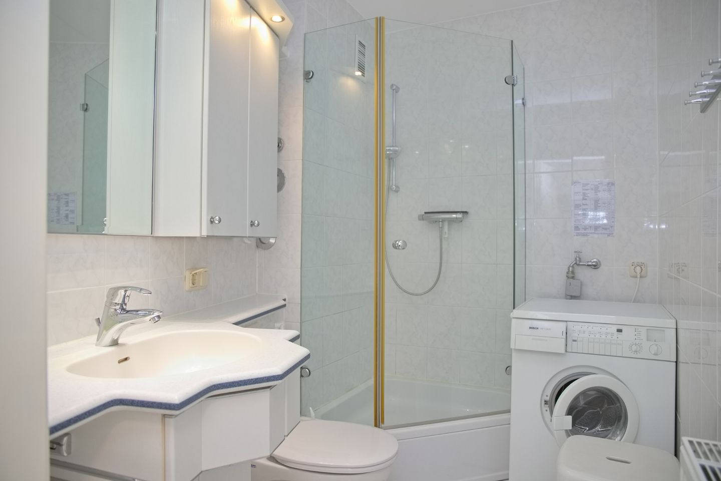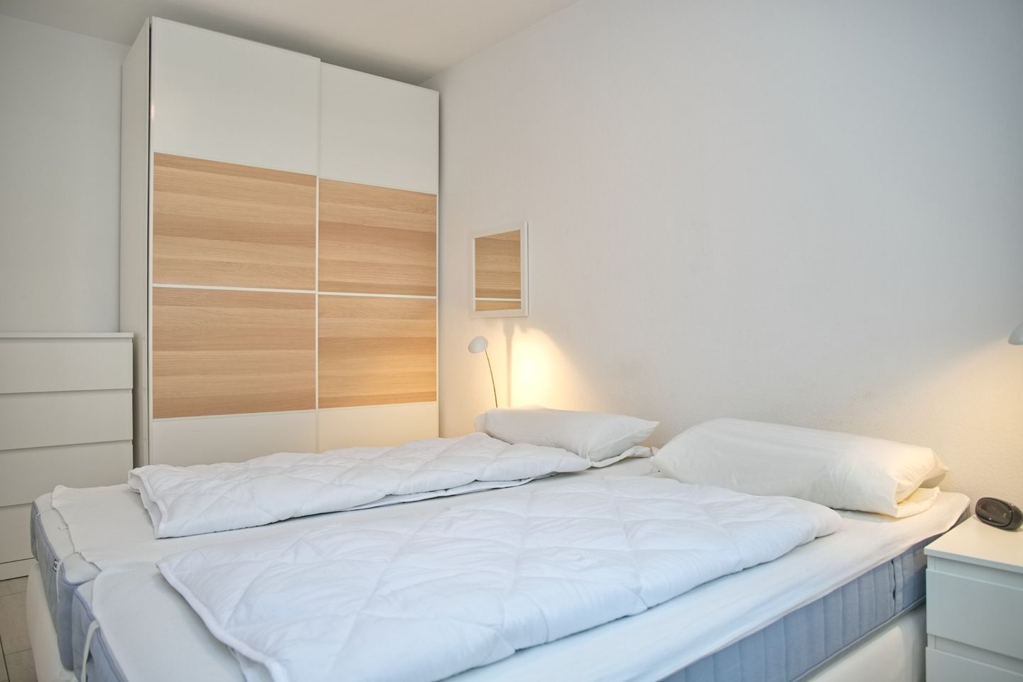 Anliegend ist die offene Einbauküche, in der ein Backofen mit Mikrowelle mit Grillfunktion, ein Induktions-Kochfeld, ein Geschirrspüler, ein Kühlschrank mit Gefrierfach, eine Kaffeemaschine, ein Wasserkocher, ein Toaster und andere Kochutensilien die Ausstattung komplementieren. Im Schlafzimmer befinden sich ein komfortables Boxspringbett sowie ein Kleiderschrank mit viel Stauraum und einer Kommode. Weiteren Stauraum finden Sie in dem Schrank im Flur. Im Bad zu finden sind ein WC, ein Waschbecken, eine Perleffekt-Dusche sowie eine Waschmaschine.