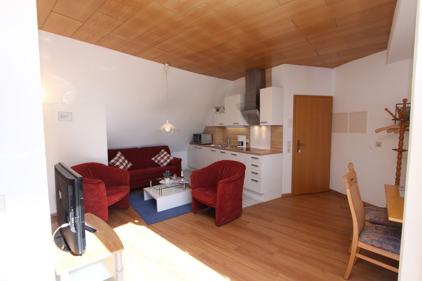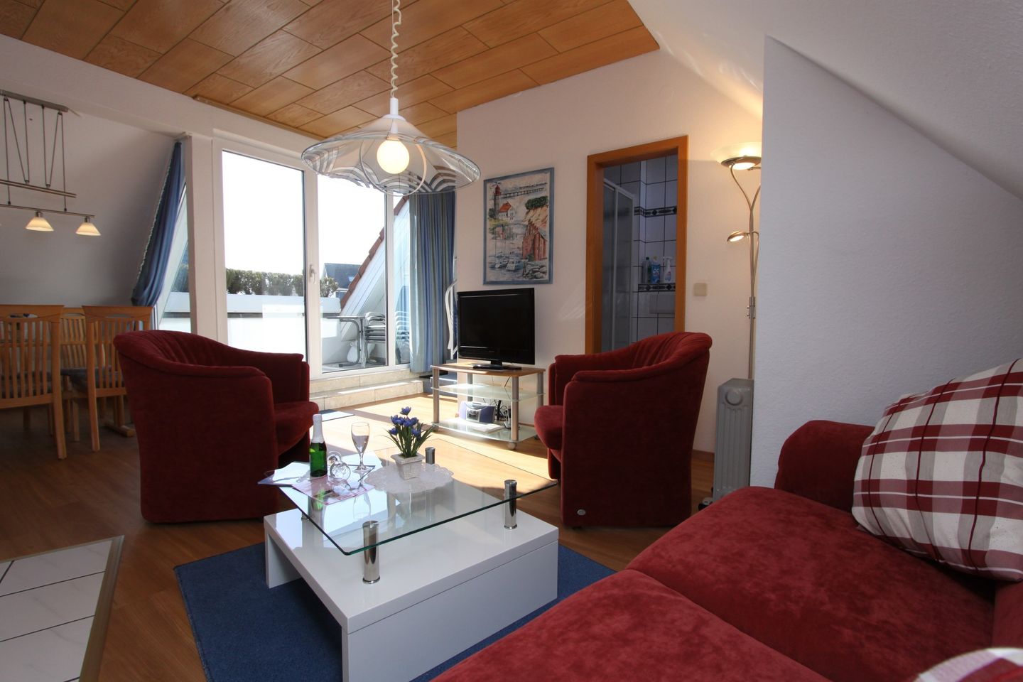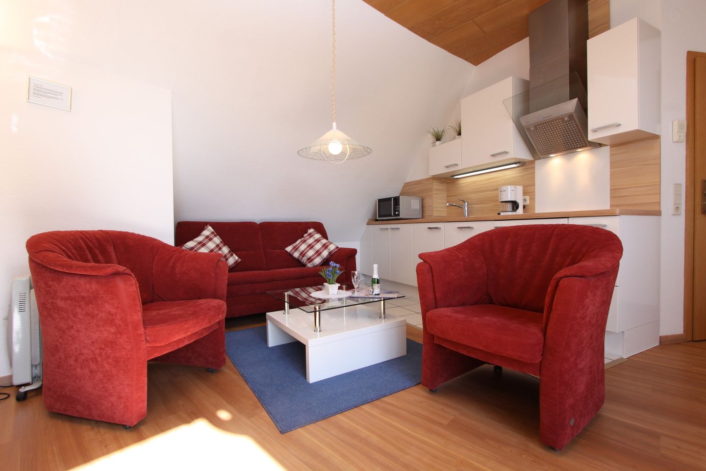 Das Appartement selbst ist mit einem hellen, offenen Wohnkonzept ausgestattet, das sowohl Gemütlichkeit als auch Funktionalität verbindet. Der großzügige Wohnbereich verfügt über ein komfortables Sofa, einen Sessel und einen Esstisch, an dem Sie gemeinsame Mahlzeiten genießen können. Eine moderne Küche mit Ceranherd, Spülmaschine, Mikrowelle und Kaffeemaschine lässt keine Wünsche offen und macht das Kochen zum Vergnügen. Für optimale Entspannung nach einem langen Tag am Strand sorgt der Zugang zu einem überdachten Balkon, auf dem Sie die frische Ostseeluft genießen können.
