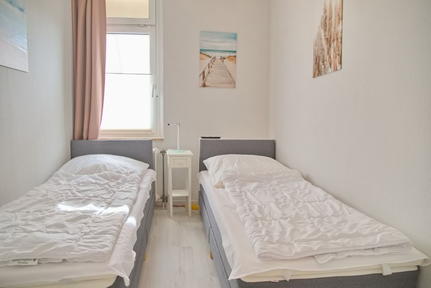 Das neu renovierte Schlafzimmer verfügt über zwei einzelne Boxspringbetten und eine Kommode, um Ihre persönlichen Gegenstände zu verstauen. Ein weiterer Smart-TV sorgt auch hier für Unterhaltung.